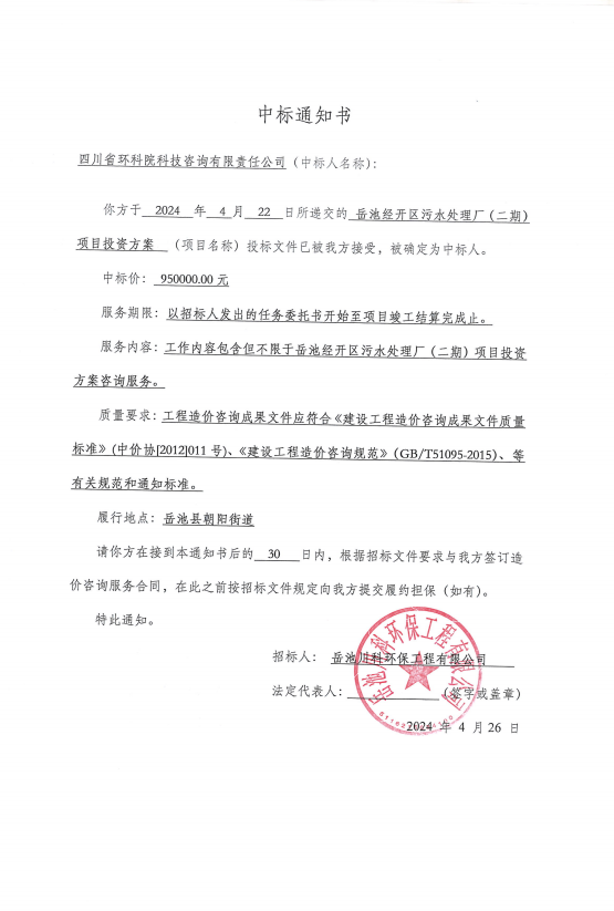 岳池經(jīng)開區(qū)污水處理廠(二期)項(xiàng)目投資方案服務(wù)—中標(biāo)通知書