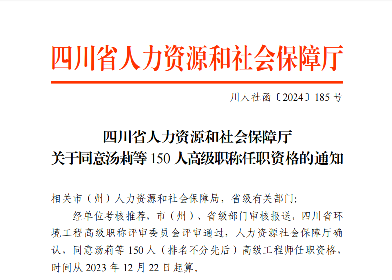 近日,四川省人力資源和社會保障廳發(fā)布了《關(guān)于同意湯莉等150人高級職稱任職資格的通知》。公司員工何雨明、張力、 韓健舟、徐雪梅、王波、羅斌等6名員工順利通過職稱評審,獲評高級工程師。在此,向他們表示熱烈祝賀!