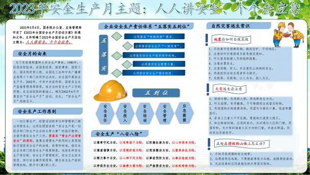 公司組織開展2023年安全生產(chǎn)月培訓(xùn)、消防安全知識(shí)宣講及地震應(yīng)急演練活動(dòng),組織員工參與全國“安康杯”知識(shí)競(jìng)賽活動(dòng),通過層層傳導(dǎo)安全責(zé)任,要求各部門牢固樹立安全生產(chǎn)責(zé)任意識(shí),做到人人目標(biāo)明確、責(zé)任到位,為開展“安全生產(chǎn)月”工作打好基礎(chǔ)。