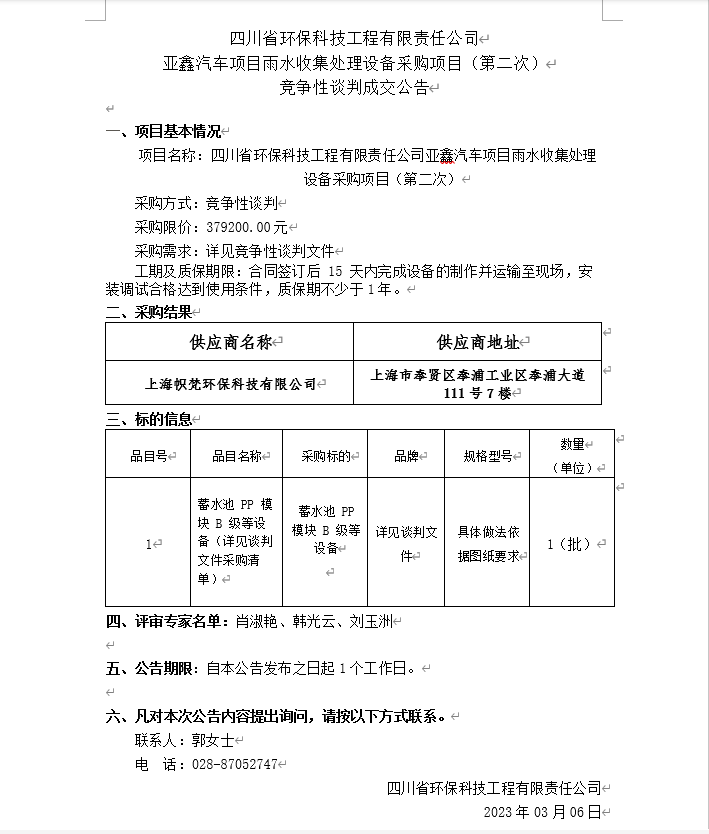 亞鑫汽車項目雨水收集處理設備采購項目成交公告
